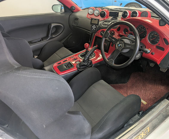 This efini RX-7 is an ex-show car from the early 2000's in Japan. It has a 5-speed manual and a single turbo converted two-rotor engine with HKS intercooler and radiator relocation kit. It is painted white with black exterior accents, with a black interior featuring Bride seats and red accents. The dash is covered in Defi aftermarket gauges, along with an Apexi FC Commander and Greddy PRofec B Spec 2 Boost Controller. 17" Zauber wheels are wrapped in Continental DWS rubber. The entire body kit is bespoke, one-of-one, and features widened fenders, canards, and a rear diffuser, along with a high GT-style adjustable wing. Ganador Super mirrors are mounted to the doors, and the car has exposed headlights with HIDs and full LED taillights. Other chassis modifications include Cusco front and rear stress bars, and Cusco underbody bracing accented by Apexi N1 coilovers. A new Kenwood touchscreen head unit is installed accompanied by period-correct Orion speakers, amps, and a competition subwoofer with custom trunk lining and enclosure.