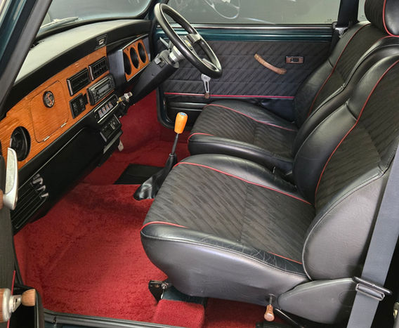 This 1994 Rover Mini Cooper is painted green with a white roof and a black interior and red carpet. The car has a 1.3-liter 4-cylinder engine, backed by a 4-speed manual transmission. It has classic-style 10" wheels, classic MK2 grille, taillights, reverse light, badging. The car features air conditioning and a aftermarket vintage momo steering wheel.