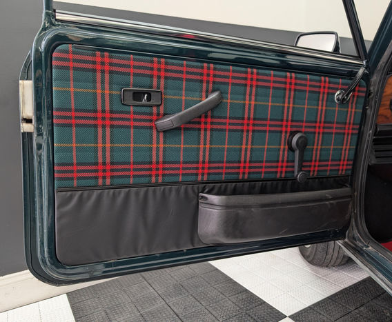 This 1995 Rover Mini Tartan is painted in British Racing Green with a white roof and Green & Red Tartan interior with Red seatbelts. The car features mini-lite style wheels and a 1.3-liter 4-cylinder fuel-injected engine with air conditioning. The engine is backed by a 4-speed automatic transmission and all other factory equipment.