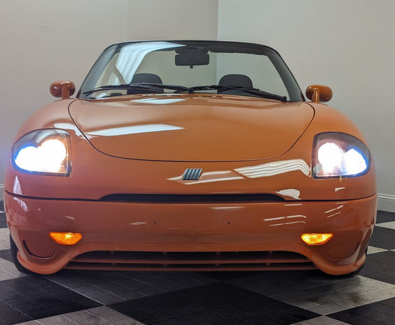 This Barchetta is painted in factory Orange over black cloth interior, and is equipped with a 1.7L 128 HP Fiat inline-4 and 5-speed manual transmission. It has a burgundy manual folding top, power mirrors, projector headlights, and air conditioning. It has a Kenwood Bluetooth head unit, 15" BWA wheels made in Italy, summer performance tires, Supersprint exhaust and exhaust header, and a Sparco brand steering wheel fitted.