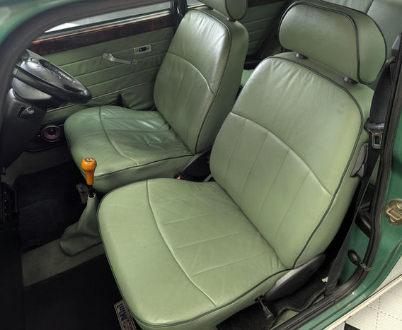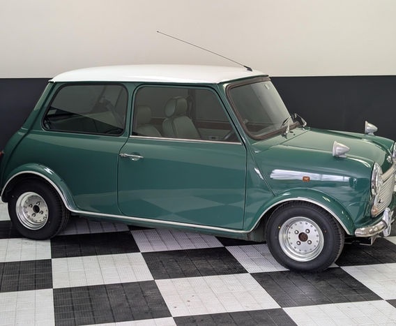 This 1998 Rover Mini is painted Almod Green a matching Green leather interior. The car has a 1.3-liter 4-cylinder fuel-injected engine, backed by a 4-speed manual transmission. It is equipped with air conditioning. Modifications include 10" T-speed wheels with new Yokohama tires, and a new US Bluetooth head unit.