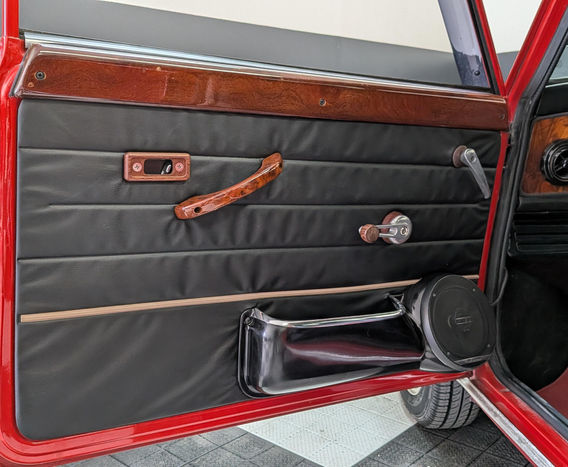 This 1999 Rover Mini Cooper 1.3i is painted red with a white roof and bonnet stripes with a black leather interior. The car has a 1.3-liter 4-cylinder fuel-injected engine, backed by a 4-speed automatic transmission. It is equipped with air conditioning.