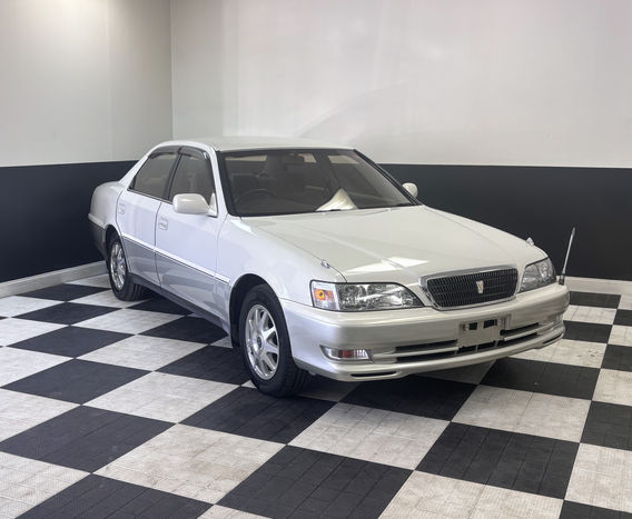 This 2000 Toyota Corona Cresta is fitted with a 1G-FE I6 engine backed by a 4-speed automatic transmission. The exterior features two-toned paint with white and silver as well as a bumper mounted parking pole. The interior features all factory equipment including factory Toyota head unit, A/C, as well as grey cloth seats.